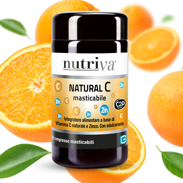 NUTRIVA NATURAL C MASTICABILE is a natural Vitamin C and Zinc food supplement. With Zinc and Vitamin C, which contribute to normal immune system function. 60 chewable tabs format.