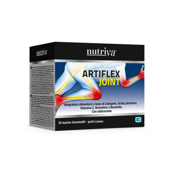 NUTRIVA ARTIFLEX JOINT Food supplement based on Collagen, Hyaluronic Acid, Vitamin C, Bromelain and Boswellia plant extract. Vitamin C contributes to normal collagen formation for normal cartilage function. Vitamin C also contributes to the protection of cells from oxidative stress and the reduction of tiredness and fatigue. Boswellia is useful for joint function and for the improvement of localized states of tension. 20 sachets format, lemon flavour.