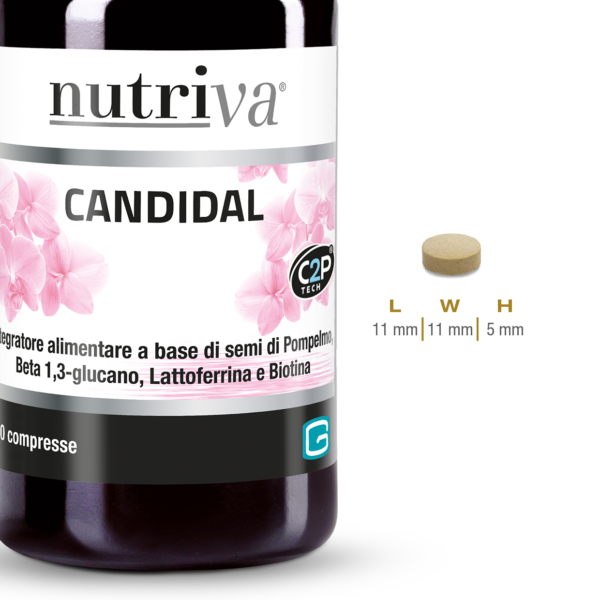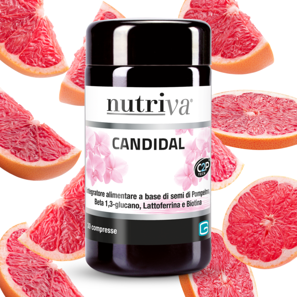NUTRIVA CANDIDAL is a food supplement with Grapefruit seeds, Beta 1,3-glucan, Lactoferrin and Biotin. 30 tabs format.