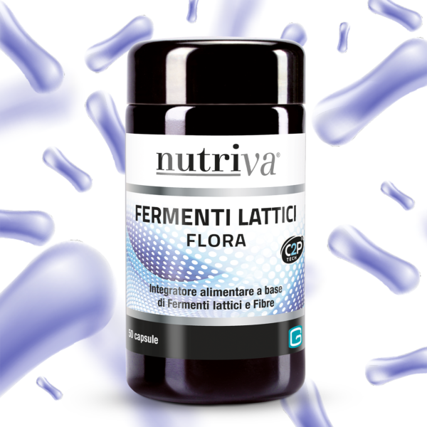 NUTRIVA FERMENTI LATTICI FLORA is a food supplement with Bacterial cultures and Fibre in gastro-resistant capsules. It helps keep gut flora balanced. 50 cps format.