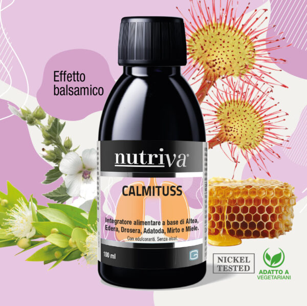 NUTRIVA CALMITUSS è un integratore alimentare a base di Altea, Edera, Drosera, Adatoda, Mirto e Miele. L’Altea supporta la funzionalità delle mucose dell’apparato respiratorio. Edera, Adatoda e Mirto contribuiscono alla fluidità delle secrezioni bronchiali. La Drosera svolge un’azione emolliente e lenitiva sulla mucosa orofaringea. Il Mirto ha effetto balsamico e contribuisce a mantenere il benessere di naso e gola.
