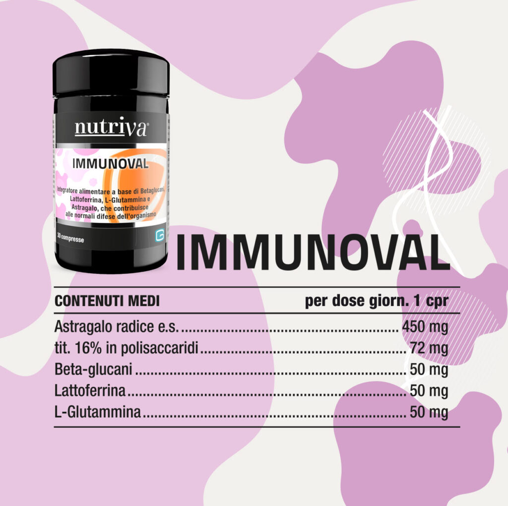 NUTRIVA IMMUNOVAL è un integratore alimentare a base di Astragalo, Beta 1,3 glucani, Lattoferrina e L-Glutammina. L’Astragalo contribuisce alle normali difese dell’organismo. Formato 30 cpr.